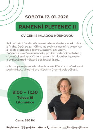 Pokračování úspěšného semináře zaměřeného na ramena se zkušenou lektorkou z Prahy. Opět zaměříme hlavní pozornost na svaly pletence ramenního, ale i jejich propojení s hlavou, pažemi a trupem. Začneme uvolňovacími cviky pro každodenní protažení, s pomůckami vytvoříme v ramenních kloubech prostor a vyzkoušíme i některé posilovací ásany. Něco zopakujeme, něco bude nové. Mohou přijít i ti, kteří minule nebyli.